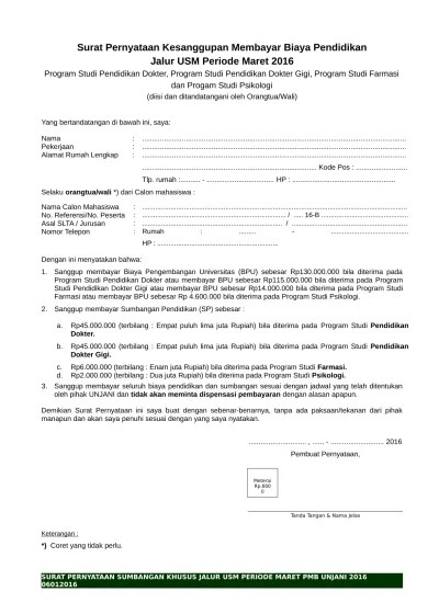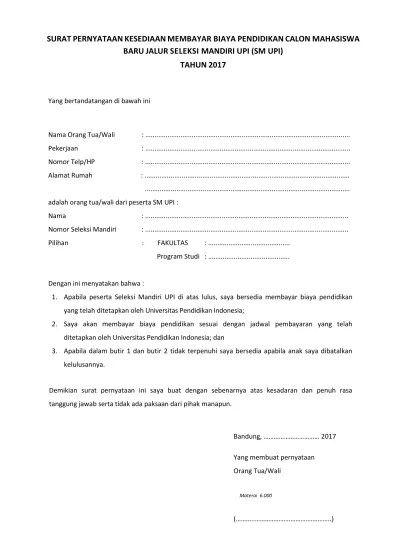 Membayar biaya perkuliahan s2 universitas islam negeri dengan biaya . (spsa) dan uang kuliah tunggal (ukt) sesuai dengan biaya pendidikan yang telah ditetapkan. Surat pernyataan kesanggupan biaya sendiri sehubungan dengan persyaratan yang. Membayar biaya pendidikan di politeknik negeri semarang sebesar rp. Pernyataan kesanggupan membayar biaya pendidikan *.